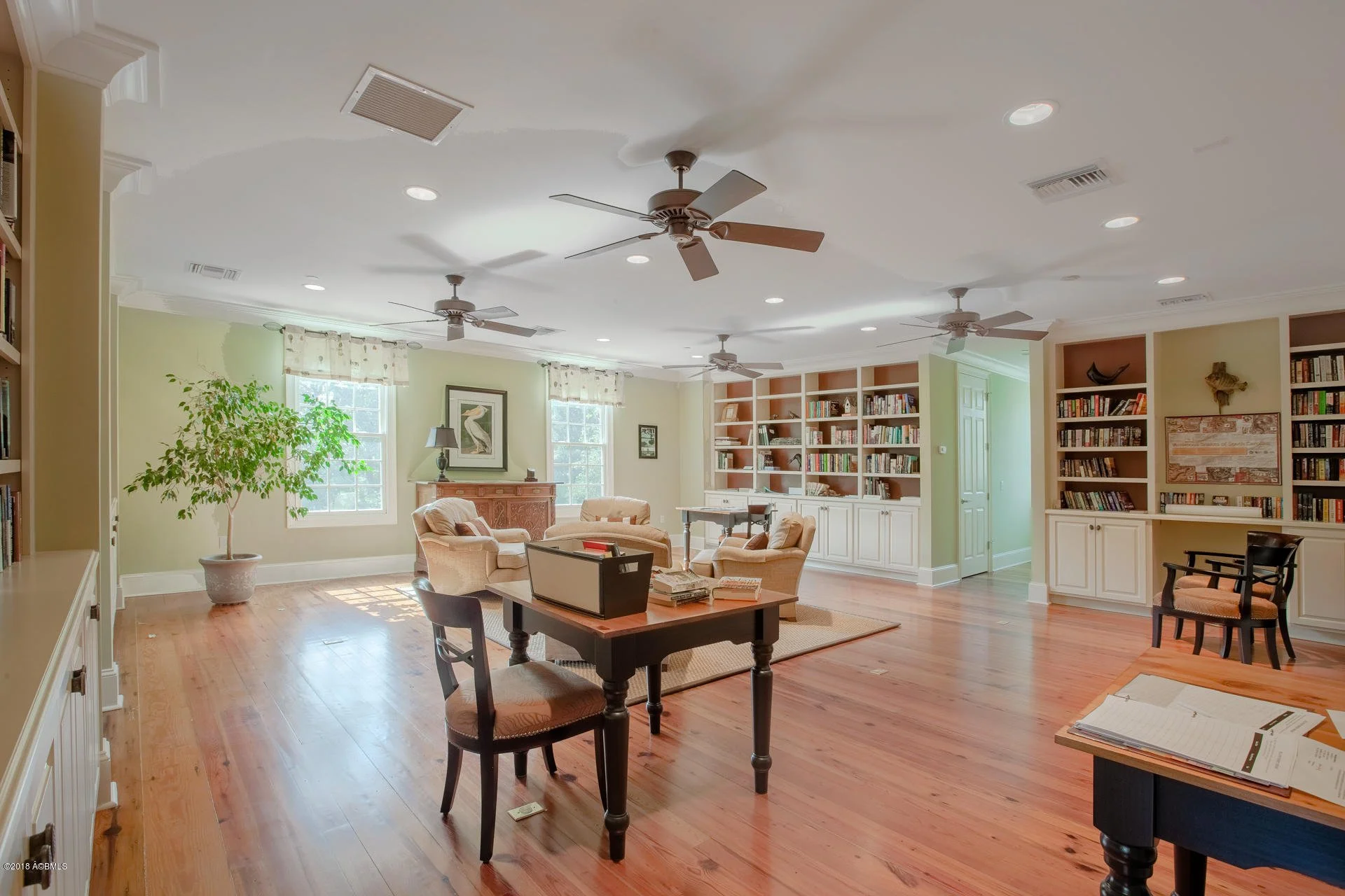 CLUBHOUSE - The clubhouse complex offers the property owners a variety of activities. The outdoor junior Olympic size pool and overlooks the marshes of Huspah Creek. The pool and pool deck include and air-conditioned pool cabana with kitchen amenities to get out of the heat. As well as an outdoor cooking area for property owners and their guests to leisure. Also available are two clay tennis courts and a state-of-the-art fitness facility. The clubhouse includes meeting rooms, fully stocked library, fitness, equipped catering kitchen, bar, event space, men’s and lady’s locker rooms, sauna & outdoor whirlpool plus a screened back porch with marsh views.
